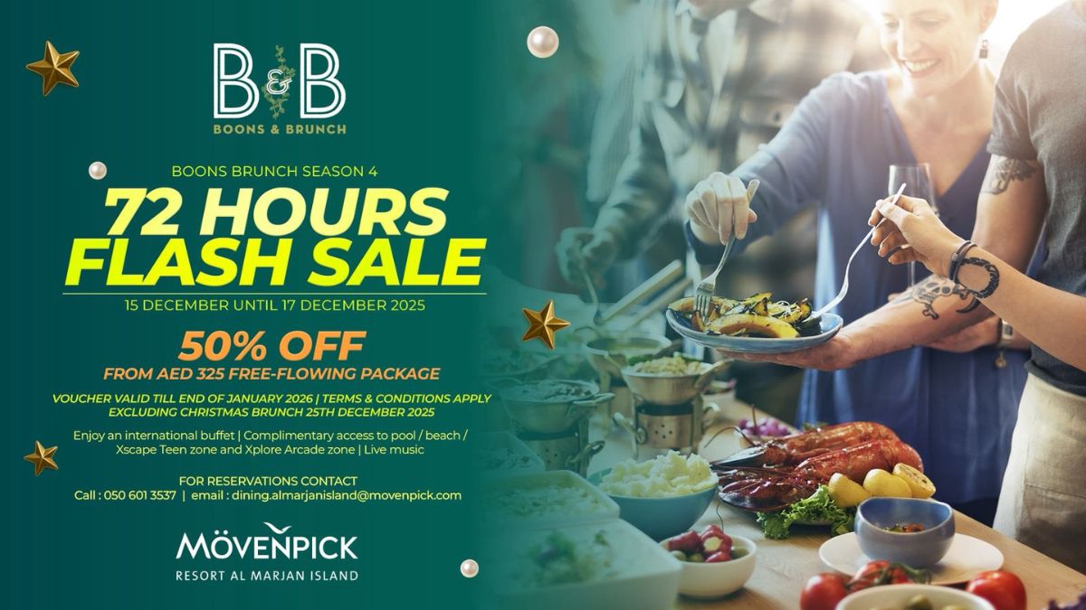 Enjoy a 50% discount on summer Brunch at Boons, Movenpick Resort, Marjan Island. Free access to Pool, Beach, Kids club, Teen zone, & Arcade zone