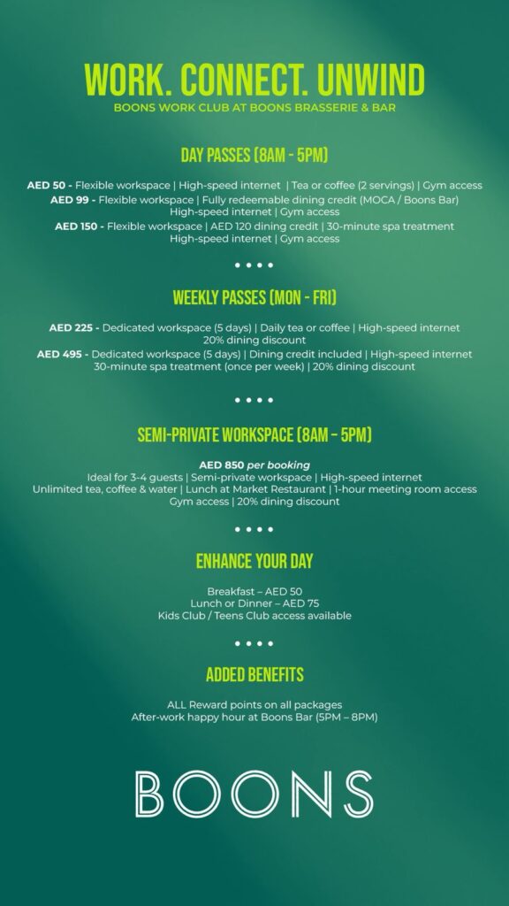 - AED 495 – Workspace + dining perks + spa treatment + 20% dining discount