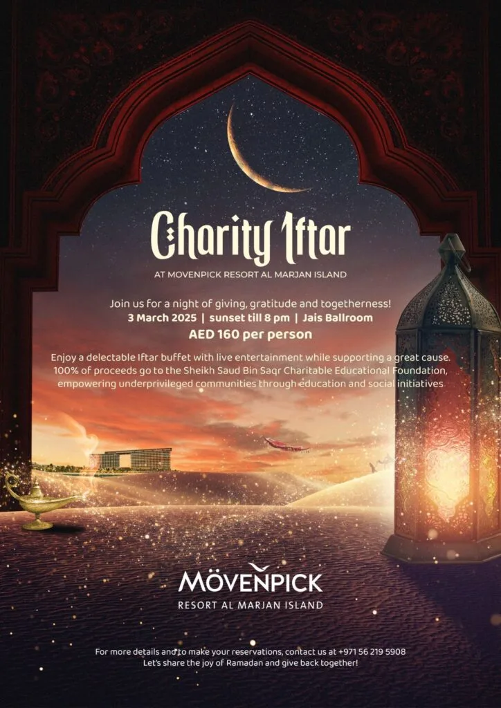 This year, Movenpick Resort Al Marjan Island is making Ramadan even more meaningful with its first-ever Charity Iftar event. Companies and individuals can purchase charity Iftar seats, with 100% of proceeds going to the Sheikh Saud Bin Saqr Charitable Educational Foundation. That means every bite you take helps support underprivileged communities through education and empowerment. Delicious food + making a difference? Sounds like a win-win.