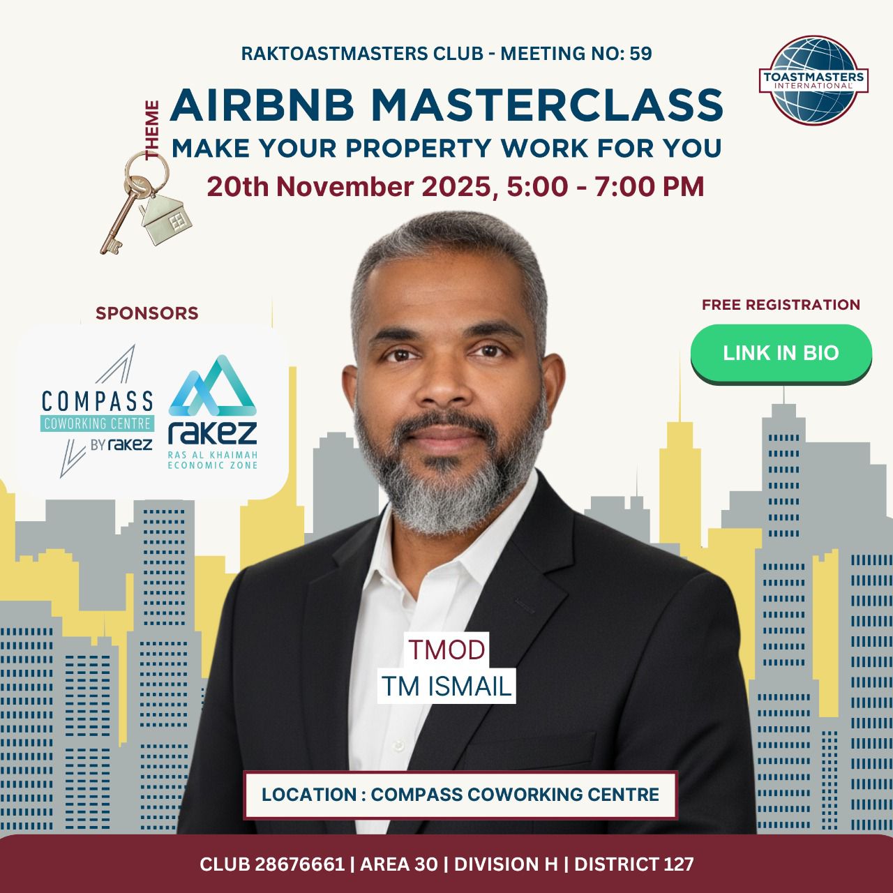 🌟 Airbnb Masterclass – Make Your Property Work for You! 🌟Join the RAK Toastmasters community for Meeting No. 59, where communication