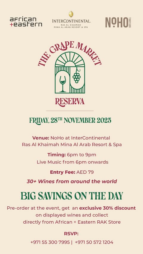 Get ready for an unforgettable evening as African + Eastern presents an exclusive Grape Market Night at the stylish NOHO, located inside the luxurious InterContinental Ras Al Khaimah Mina Al Arab Resort & Spa 🍷✨