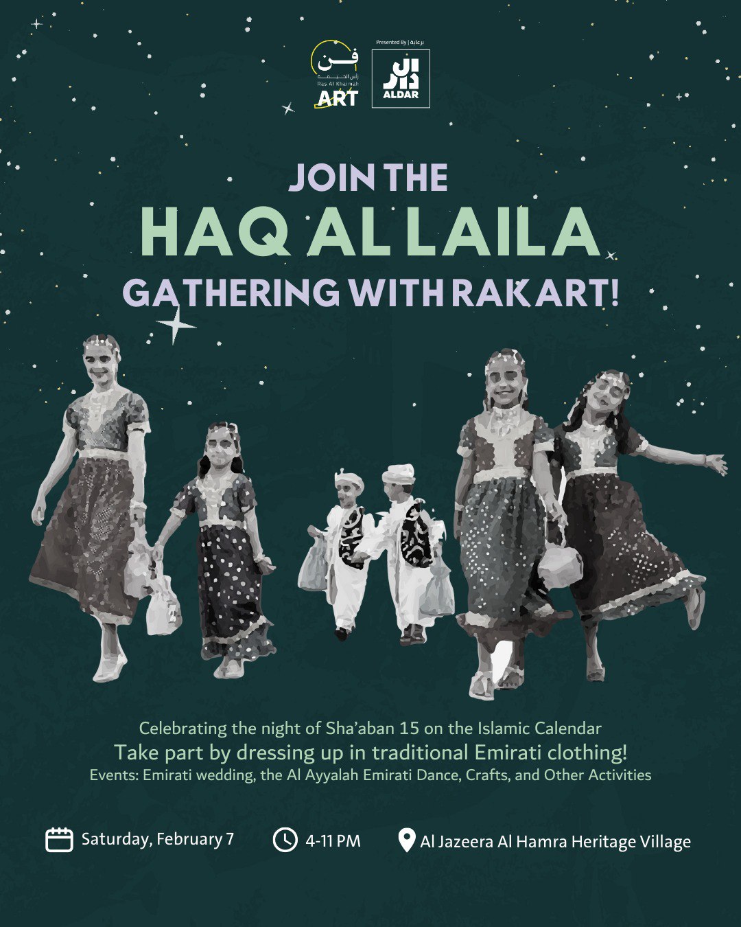 RAK Art Foundation (RAKART) invites the community to come together for a vibrant cultural celebration as Haq Al Laila is marked at the historic Al Jazeera Al Hamra Heritage Village. This special gathering honours Emirati heritage, traditions, and the spirit of togetherness through an evening filled with culture, music, and meaningful experiences. 🕌🤍