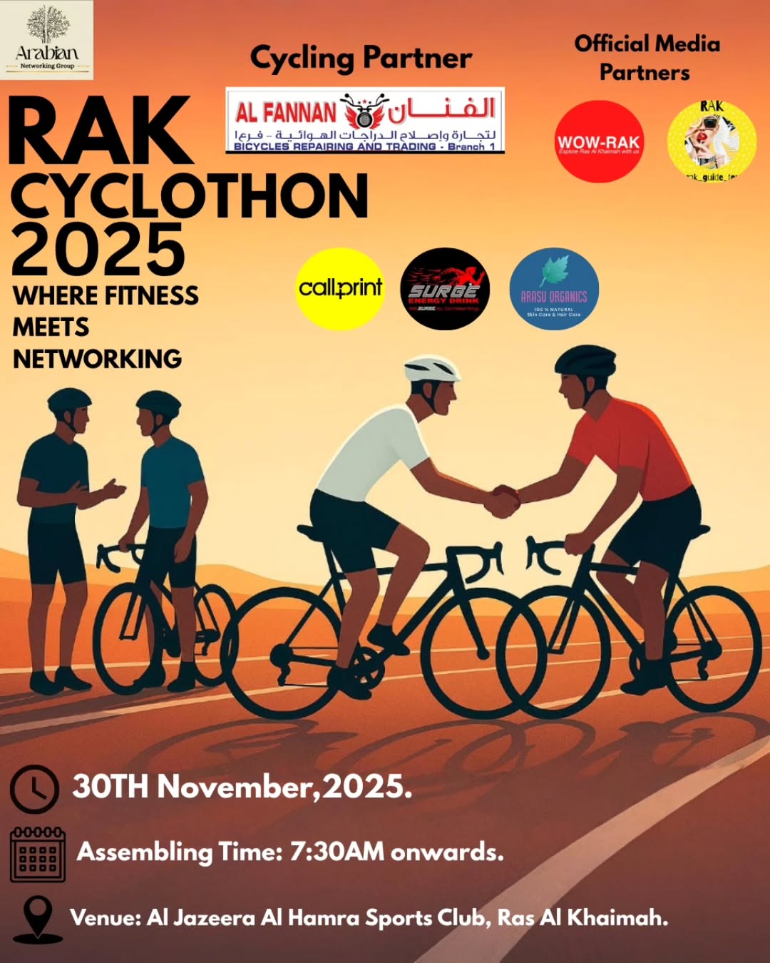 Get ready for an adrenaline-filled morning of community, fitness, and fun as ANG – Arabian Networking Group proudly presents the RAK Cyclothon 2025! This large-scale cycling event is all set to bring together cycling enthusiasts, fitness lovers, entrepreneurs, and families for a day celebrating health, energy, and human connection. 💪💫