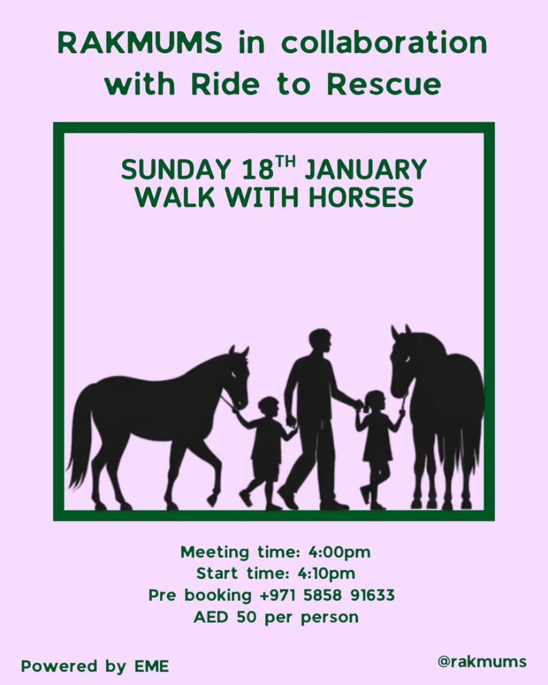 The participation fee is AED 50 per person, with all proceeds going directly towards care bills for the horses, helping provide feed, shelter, and medical support π©Ίπ. Participants are encouraged to come prepared with proper walking shoes, sufficient water, sunglasses, and light snacks to enjoy after the walk βοΈπ₯€.