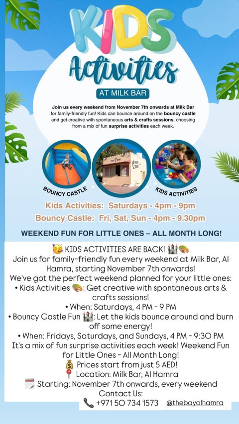 Get ready for weekends full of laughter, creativity, and excitement! Starting November 7th onwards, Milk Bar, Al Hamra invites families to enjoy KIDS ACTIVITIES designed to make every weekend special. 💕