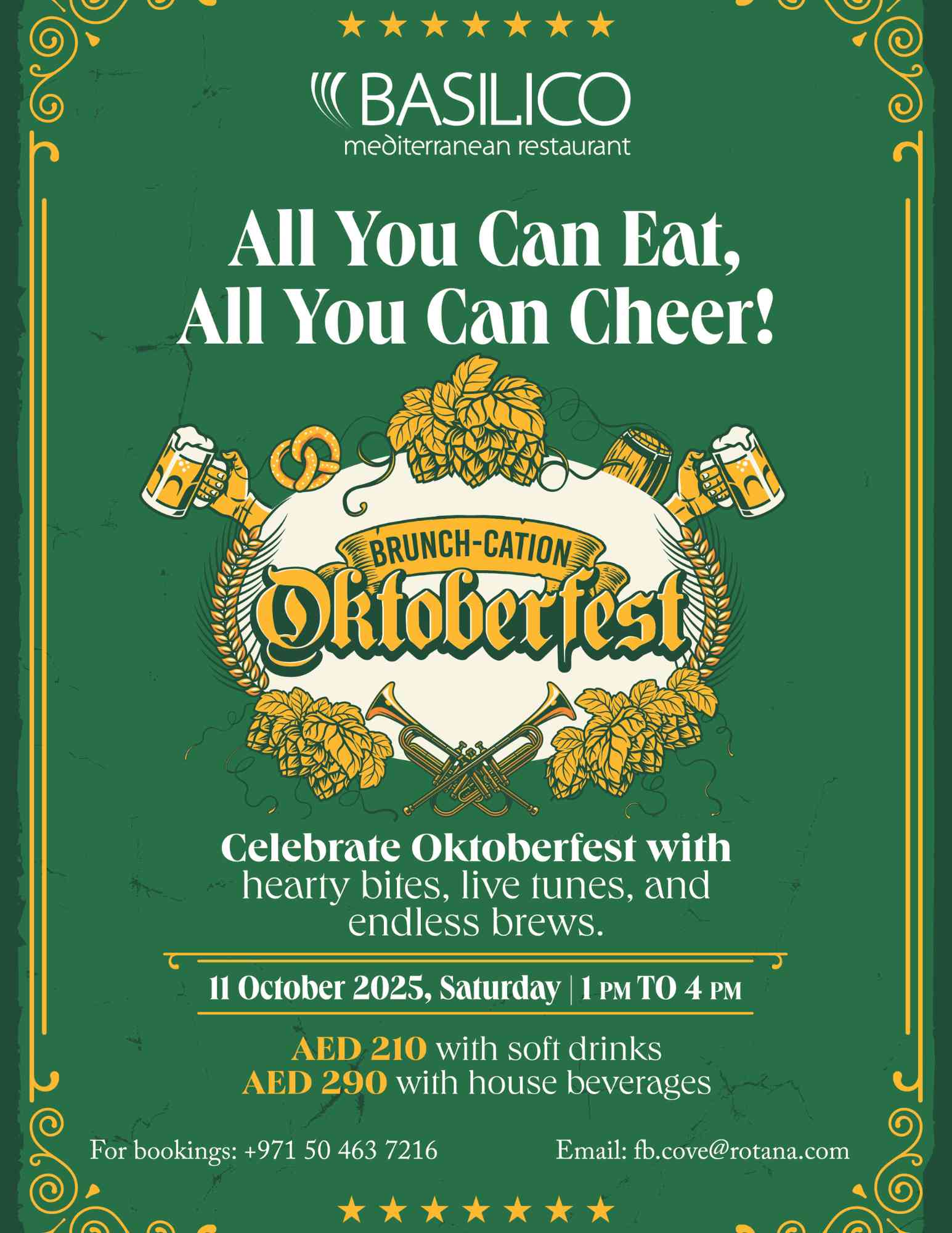From the first bite to the last sip, Basilico is going full throttle on Oktoberfest spirit. Think golden brews, hearty German-inspired eats, and music that makes you want to tap your feet even if you swear you “don’t dance.” This isn’t your average brunch—it’s basically a three-hour passport to Oktoberfest without needing a Schengen visa.