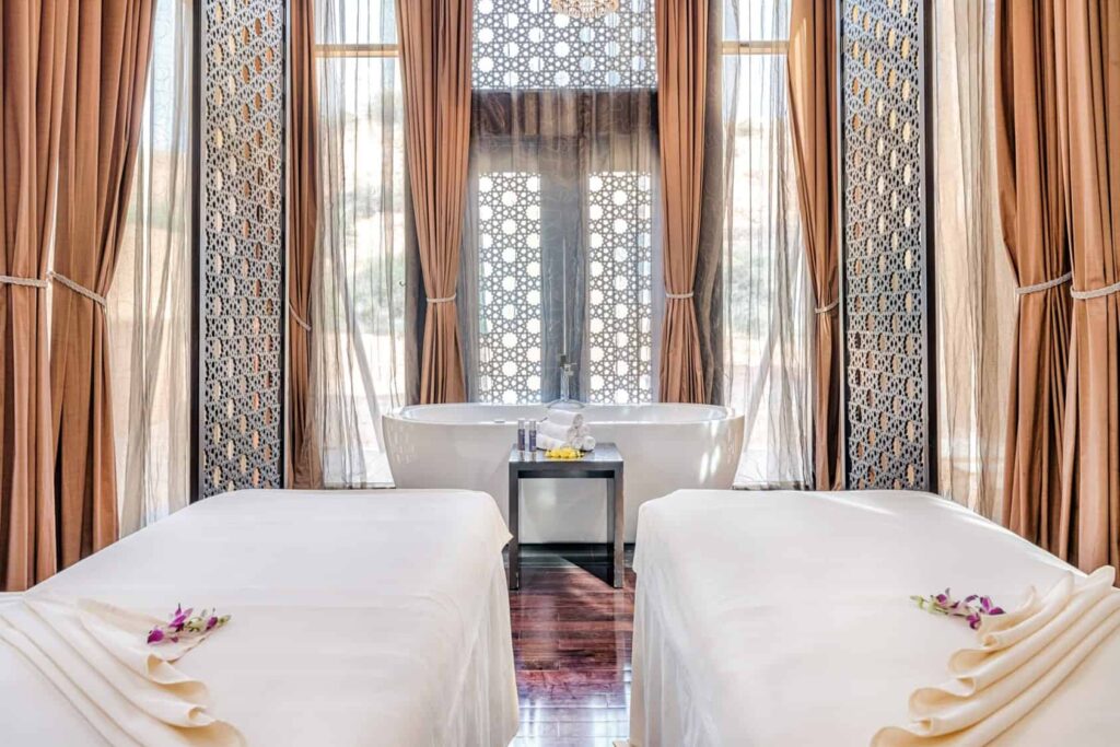 The spa features lavish treatment pavilions and state-of-the-art hydrotherapy facilities, a refined setting for an ultimate retreat in the majestic desert.