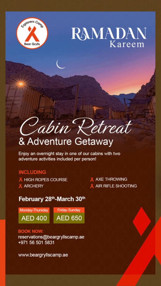 Alright, folks—Ramadan is here, and while some may be planning cozy iftars at home, we’re here to shake things up. What if you could break your fast under a star-lit sky, surrounded by the rugged beauty of Jebel Jais, after a day packed with adventure? Sounds epic, right? Well, pack your bags (and maybe some extra courage) because Bear Grylls Explorers Camp is offering the ultimate nature escape this season.