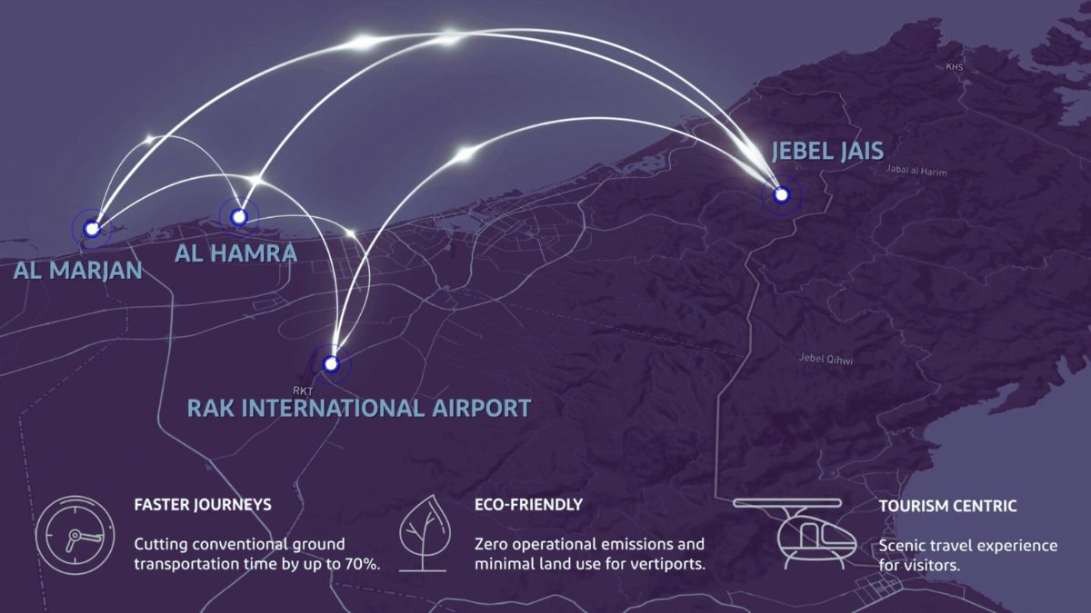 Citywide vertiports to link Al Marjan, Al Hamra & Jebel Jais; Al Marjan → Jebel Jais cut from ~70 min to <20.