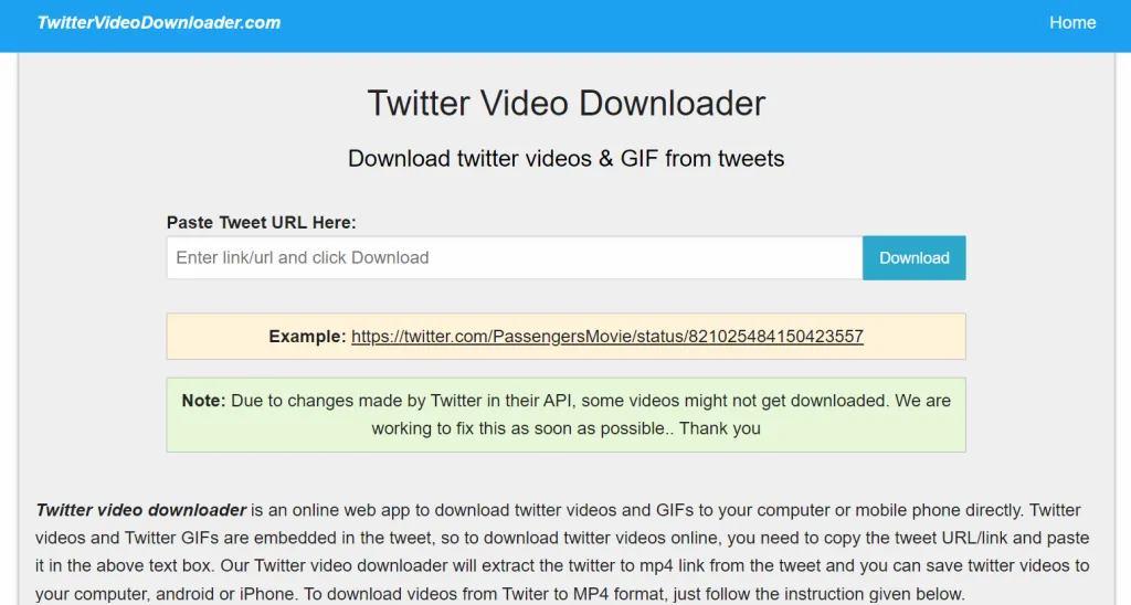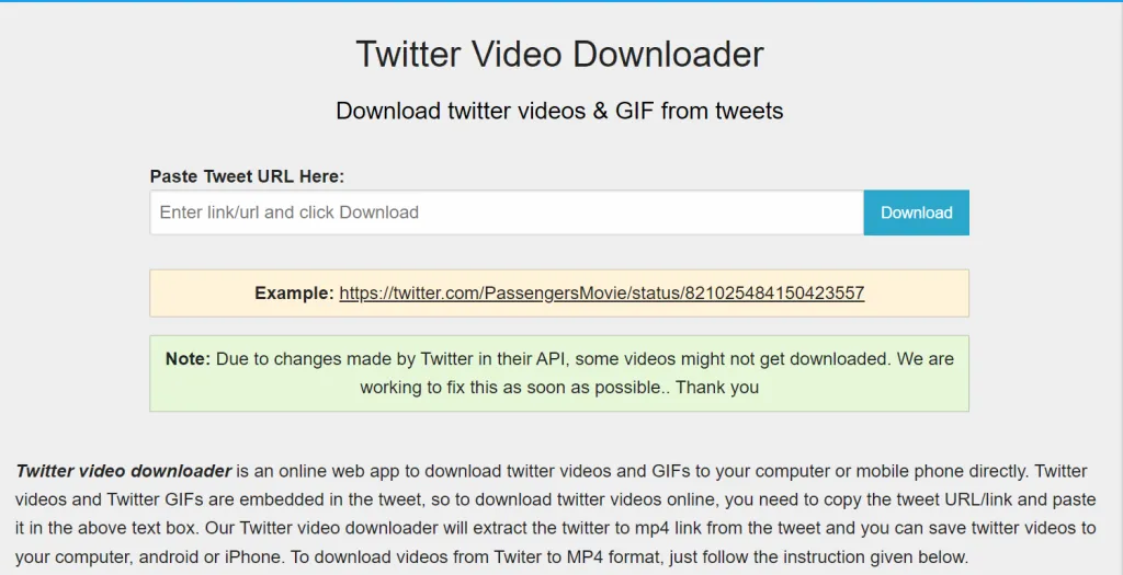 Looking a reliable tool to download Twitter videos easily? TWDOWN is the solution for you. This tool not only supports Twitter video downloads, but also videos from other platforms. The website boasts of a powerful server that makes downloading faster, making it one of the most reliable sites to download videos from Twitter.