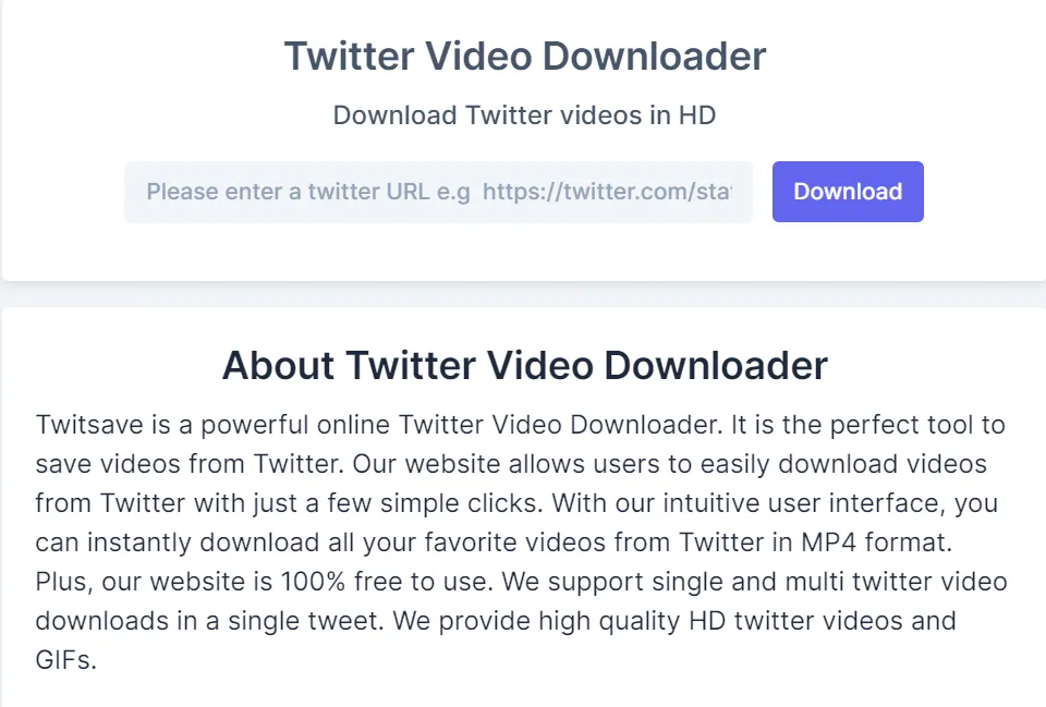 Twave is an online Twitter Video Downloader that allows you to save videos from Twitter with just a few clicks. It offers a user-friendly interface and high-quality videos in HD format. The service is entirely free, and it supports both single and multi-video downloads from a single tweet. With Twitsave, you can download both twitter videos and GIFs.
