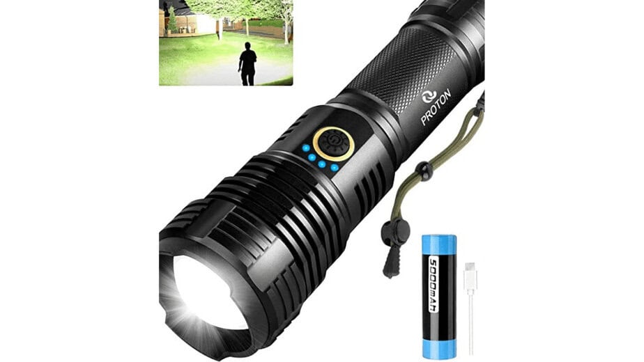 Proton Rechargeable Led Flashlight is beaming with confidence. This flashlight emits 9000-90000 lumens, making it the most potent L.E.D. The flashlight is on the market today. It is entirely rechargeable so that you can power up the flashlight anywhere.