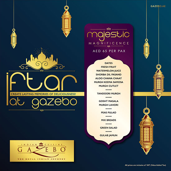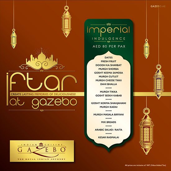 Celebrate with your loved ones and revel in an exquisite Iftar at Gazebo. Choose from an impeccable assortment of the finest Indian delicacies specially selected to make your Iftar unforgettable. Come savour the flavours of yesteryears and create wonderful memories over an extraordinary feast.