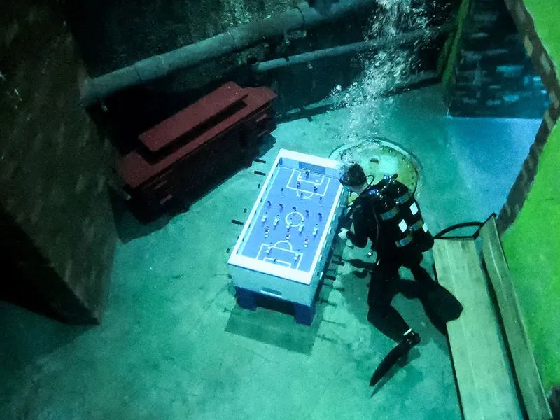 Once under, visitors will discover an underwater metropolis that conjures up the lost city of Atlantis with graffiti, crumbling facades and a giant portrait of Marilyn Monroe hanging on the wall. There’s also a library and even an arcade featuring games including a table football, a pool table, as well as a vintage Pac-Man machine. The diving complex also features an 80-seat restaurant equipped with large windows and TV screens, which non-diving visitors to peek inside the pool as divers swim by.