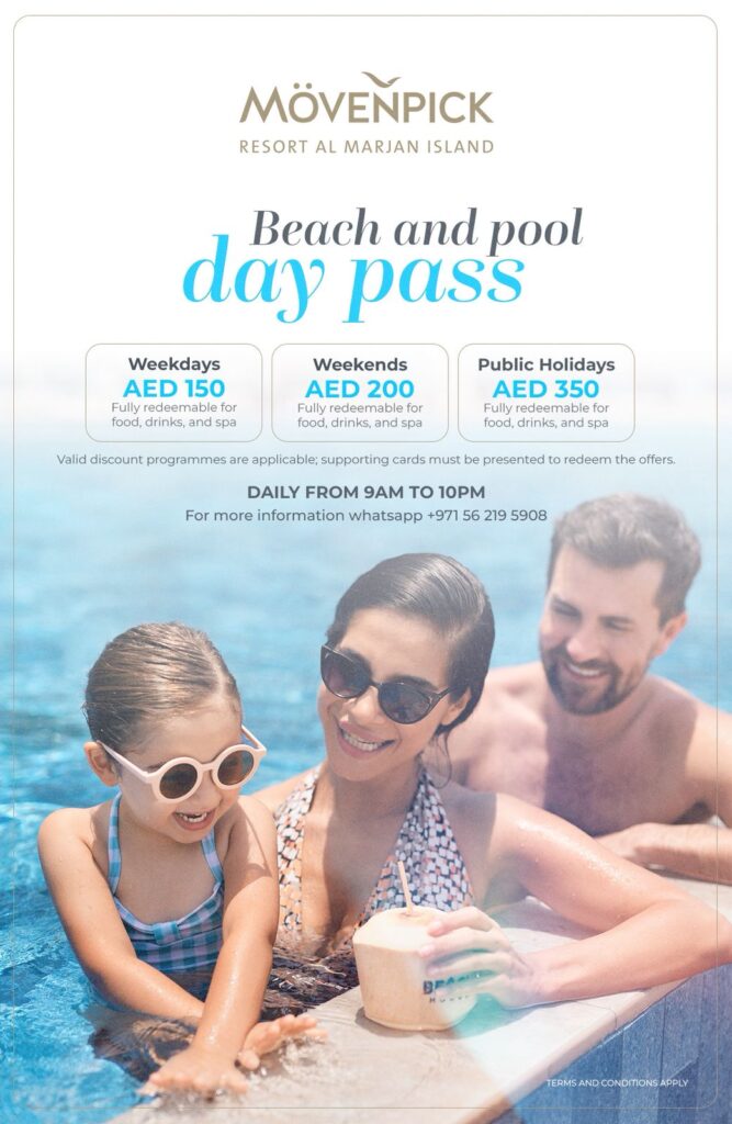 And lucky for you, Mövenpick Resort Al Marjan Island is basically serving that vibe on a silver platter — with two epic day pass options that might just ruin regular weekends forever.